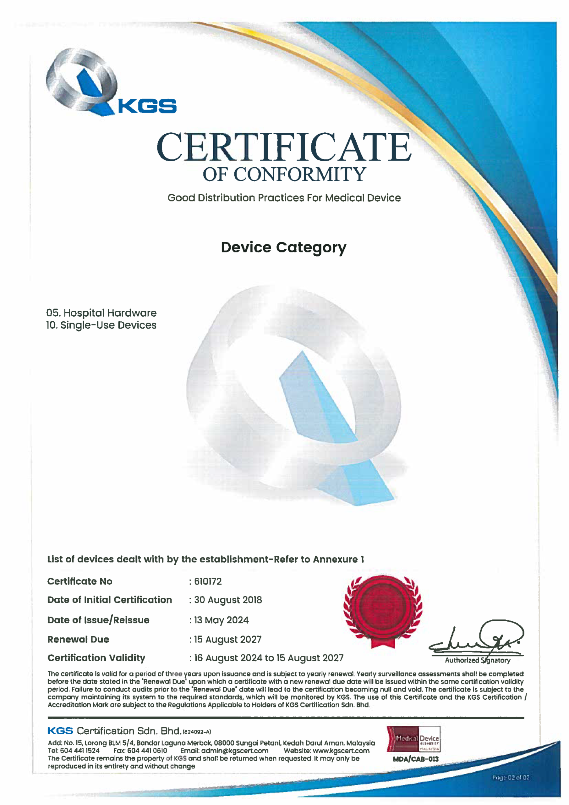 With the GDPMD certificate, we have been accredited & certified in dealing with medical devices and have put in place a quality distribution system in our organization. By doing this the quality of the medical devices are maintained throughout the storage and distribution process for all government and private hospitals, clinics and for clients with clean room environments as well.
