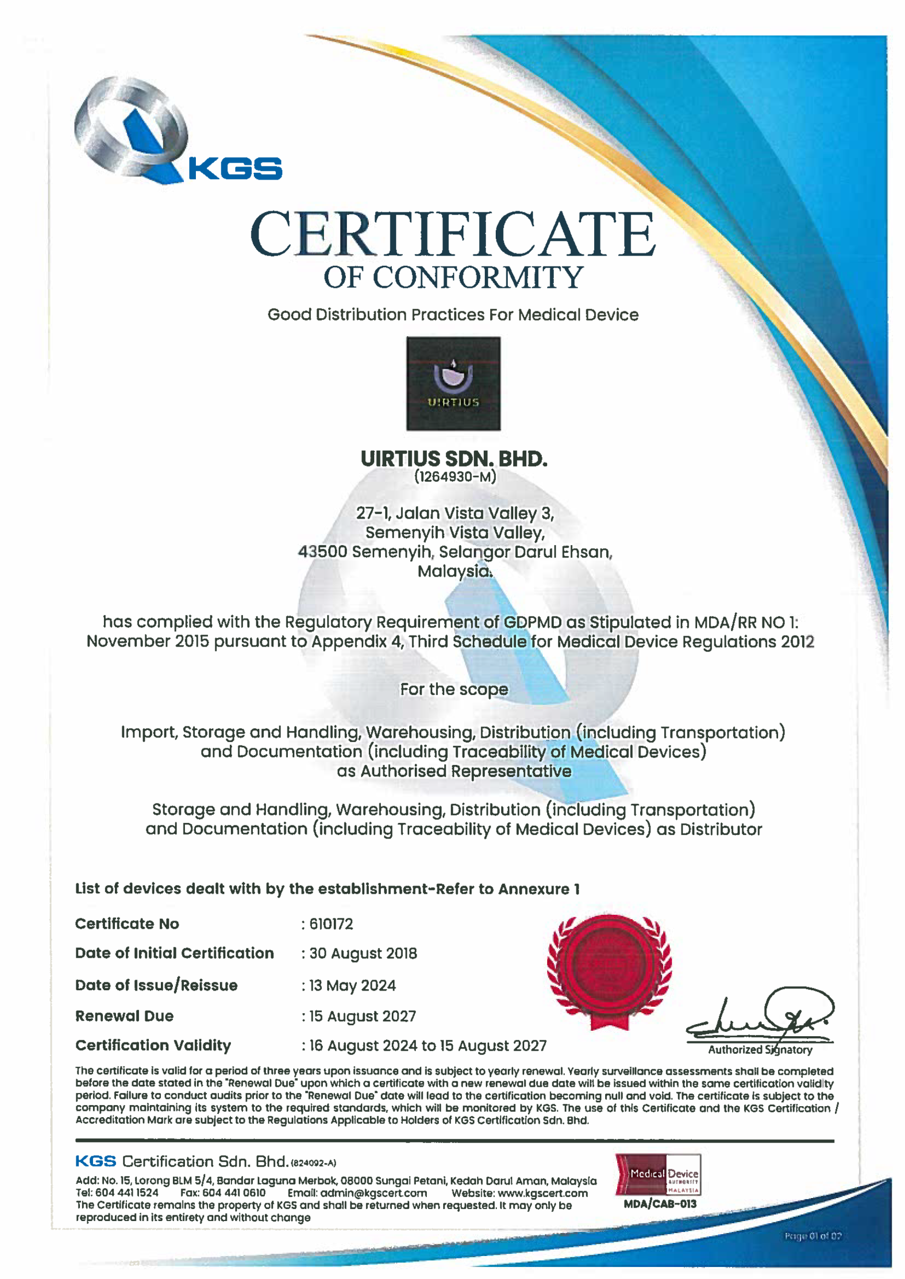 UIRTIUS was founded in January 2018 as a sole purpose to provide and supply quality and innovative medical devices to enhance the quality of healthcare for all human race. In our pursuit for quality innovative medical devices and ensure all governance are adhered, UIRTIUS was certified with Good Distribution Practice for Medical Device (GDPMD).